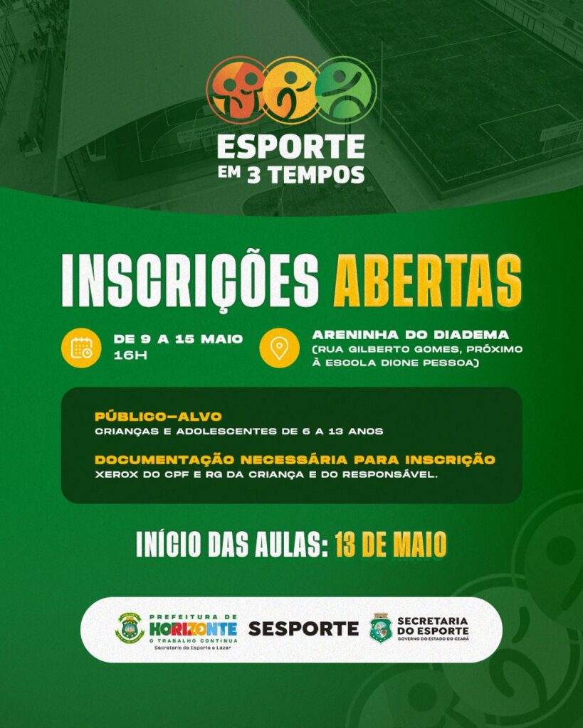 A Prefeitura de Horizonte, por meio da Secretaria de Esporte e Lazer, em parceria com a Secretaria do Esporte do Governo do Estado do Ceará, está com inscrições abertas para o Projeto Esporte em 3 Tempos. A iniciativa tem como objetivo democratizar o acesso ao esporte e promover o desenvolvimento integral de crianças e adolescentes, por meio de ações que estimulam a cidadania, a convivência social, a qualidade de vida e a socialização do conhecimento.
