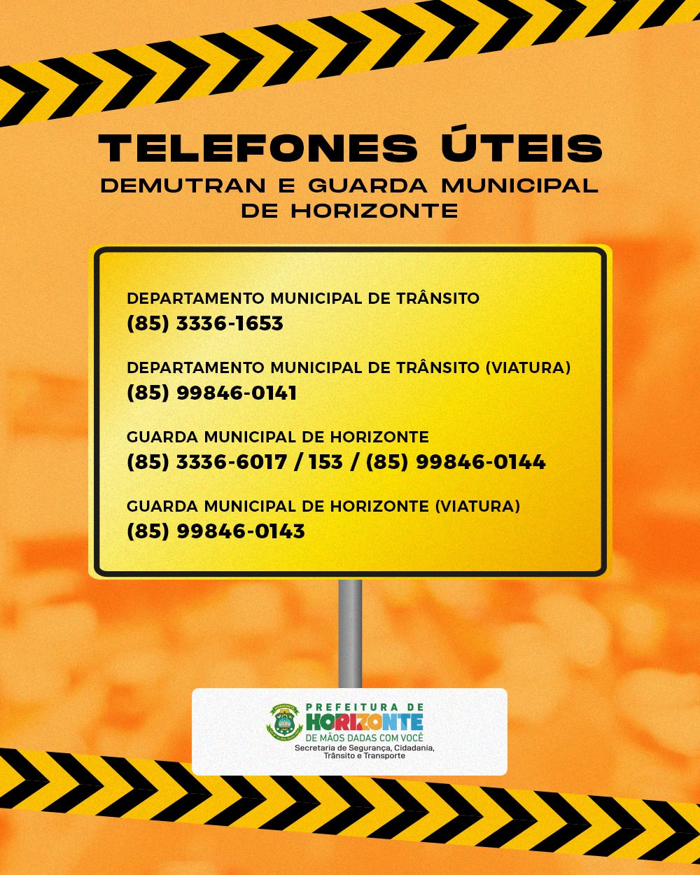 A Prefs através da Secretaria de Segurança, Cidadania, Trânsito e Transporte divulga os números de telefone do Demutran e Guarda Municipal de Horizonte para atendimento ao público.
