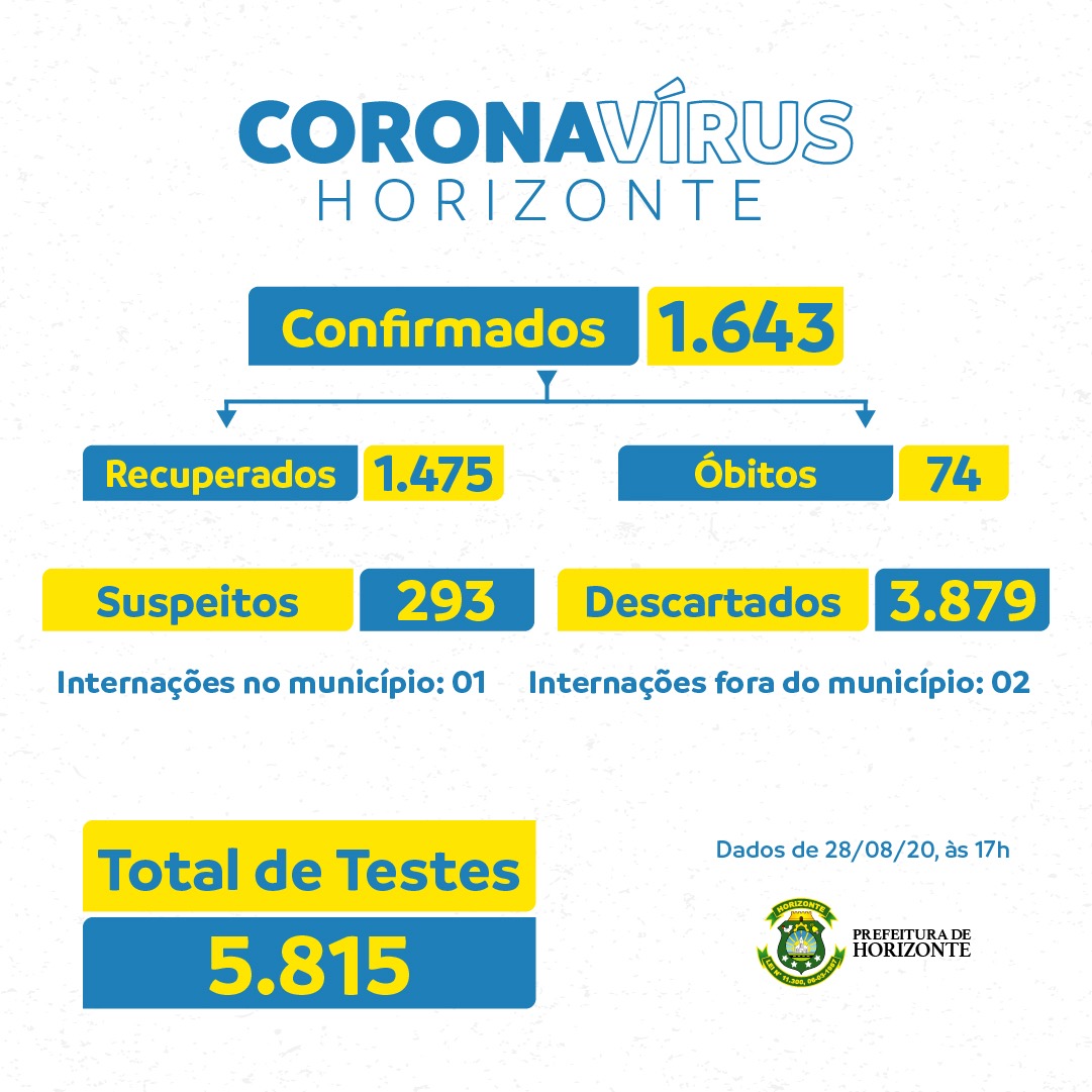 São 1.643 casos confirmados de Covid-19 em Horizonte, entre os quais 1.475 são pacientes recuperados, 94 são pacientes em tratamento e 74 são óbitos decorrentes da doença.