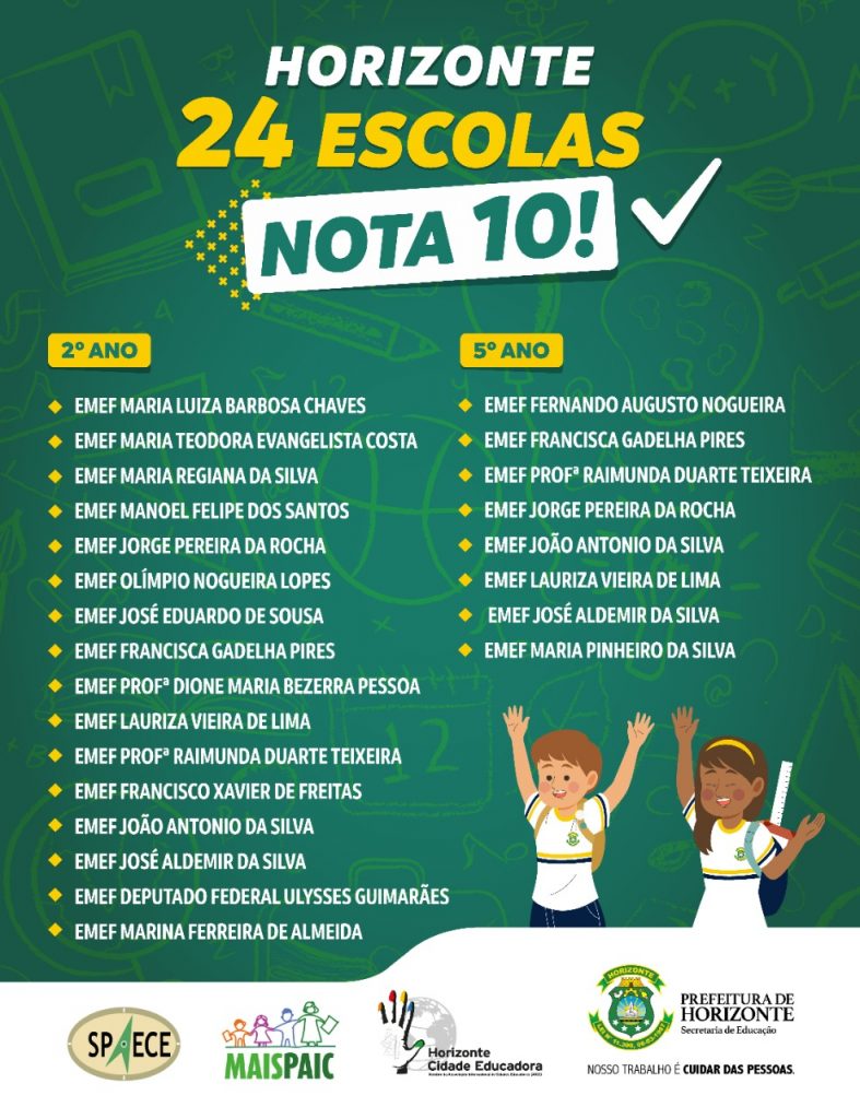 Mais uma grande conquista para a Educação de Horizonte. Nosso município tem 24 escolas NOTA 10!