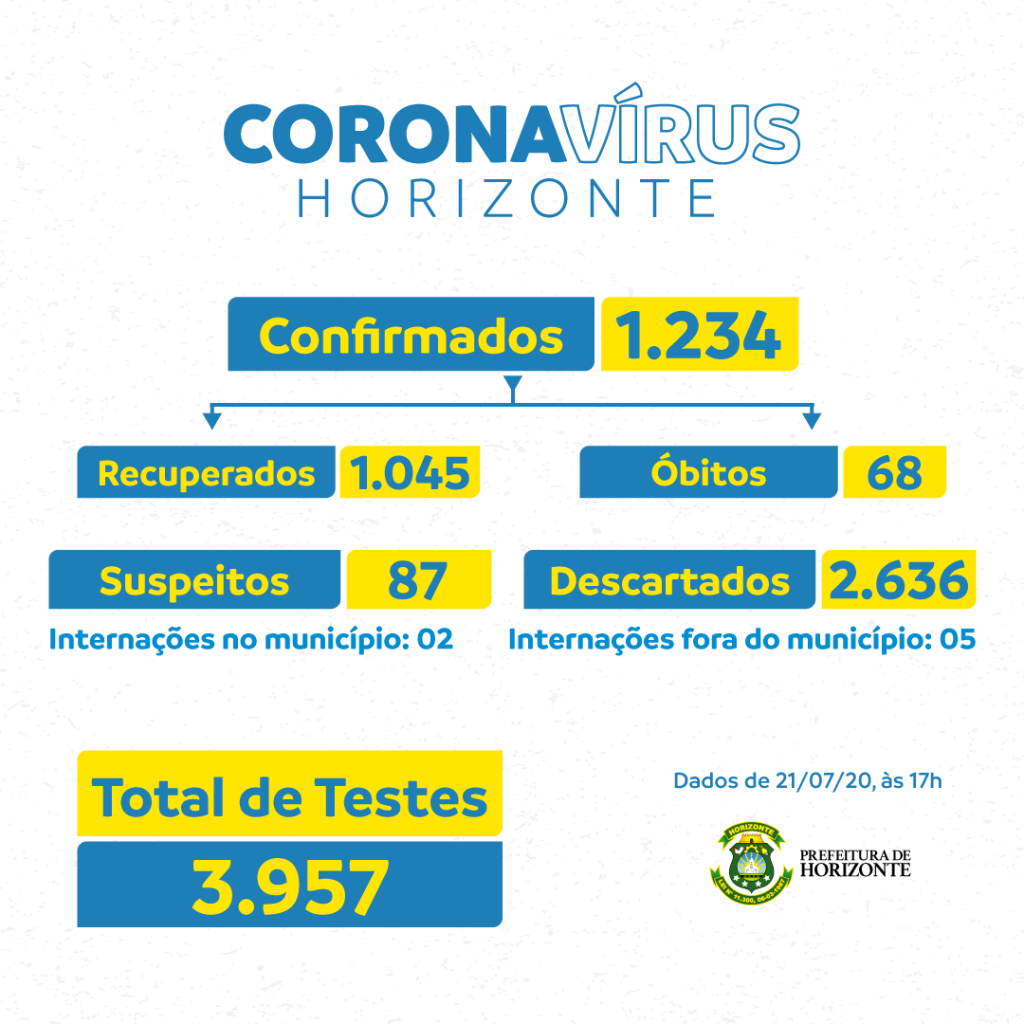 Dos 1.234 casos confirmados de Covid-19 em Horizonte, 1.045 estão recuperados, entre eles está o último paciente que estava internado no Hospital de Campanha, que teve alta médica hoje (21).