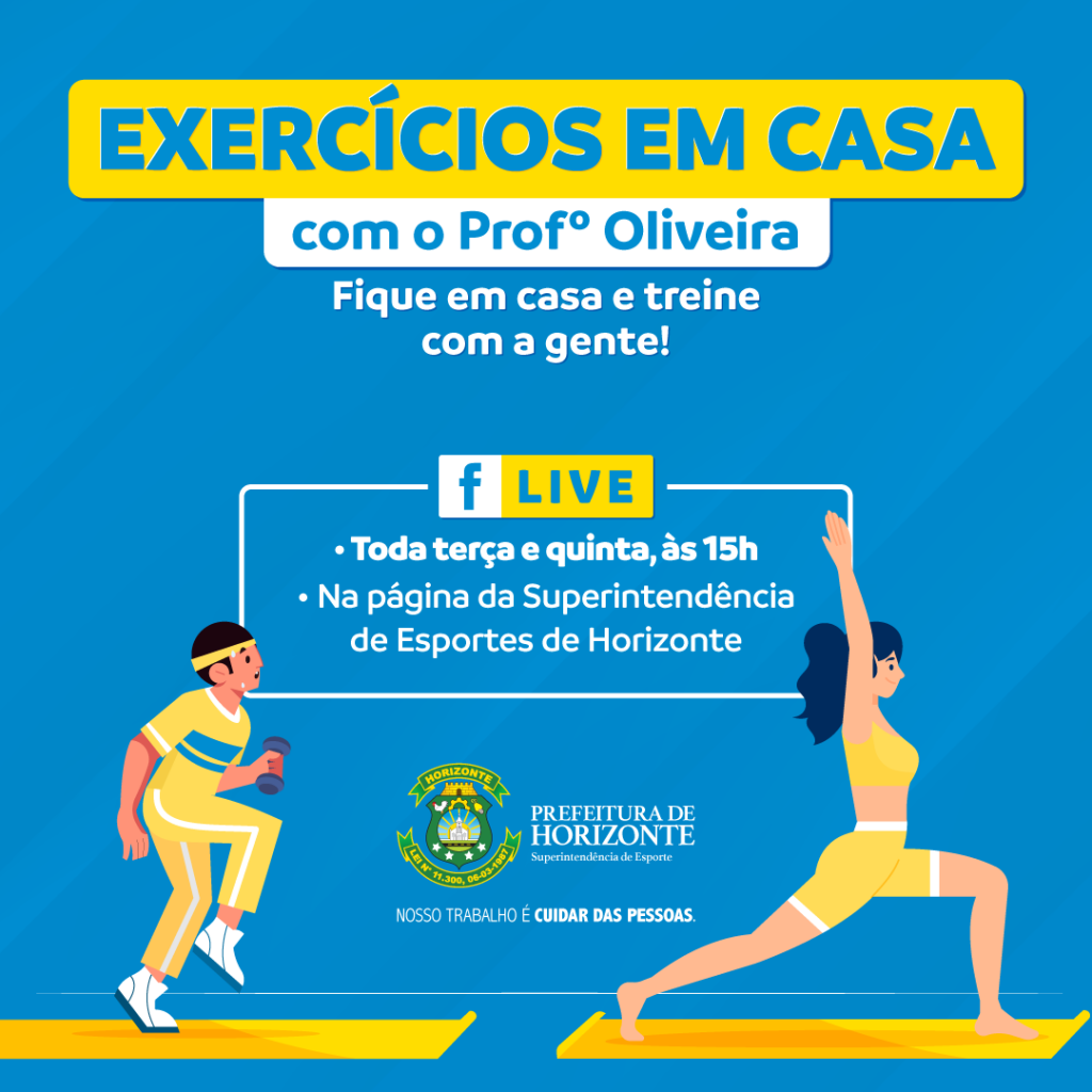 Semanalmente a Superintendência de Esportes de Horizonte transmite ao vivo em sua página oficial no Facebook atividades, treinos e exercícios fácies e práticos de serem realizados dentro de casa, na sala, quarto ou quintal.