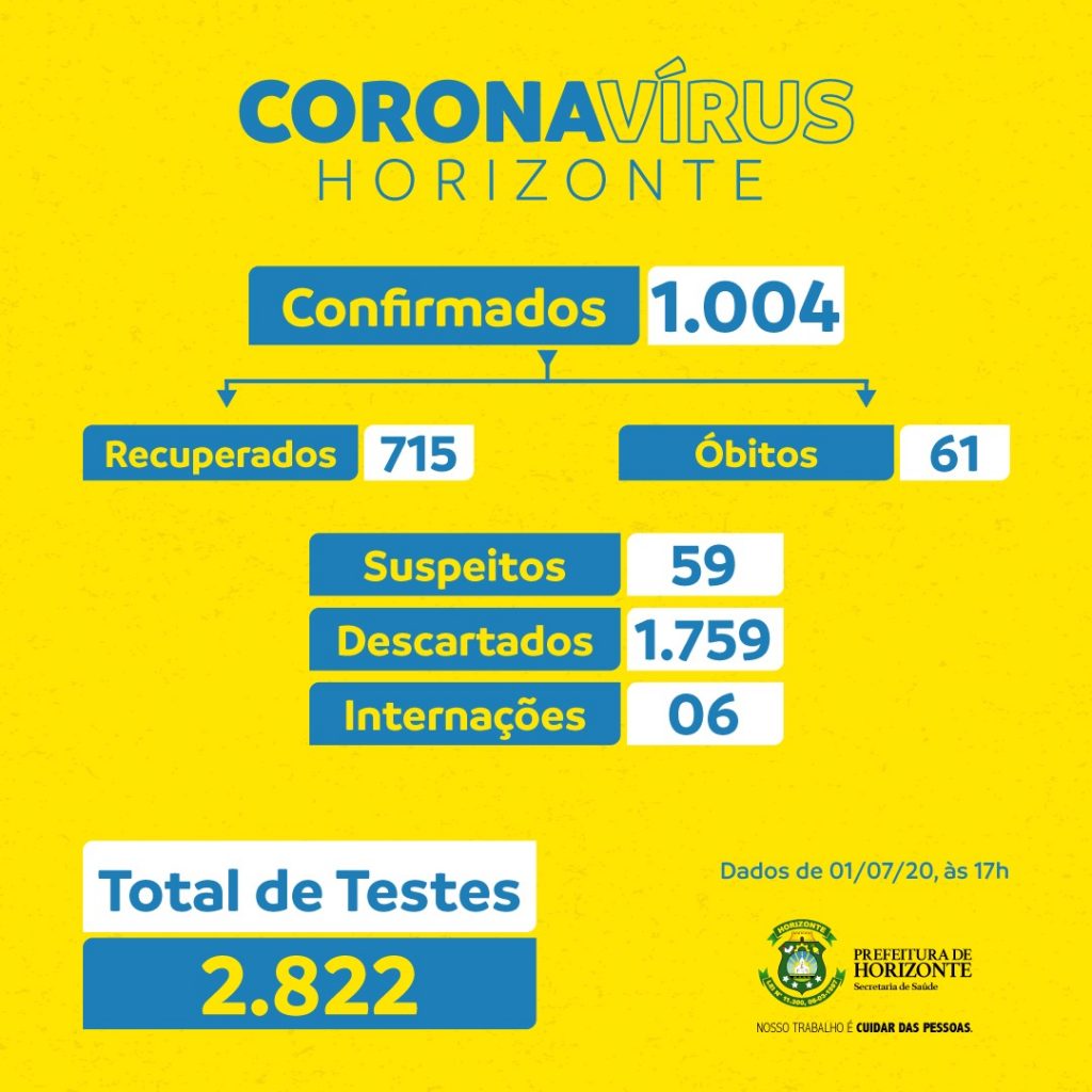A Prefeitura de Horizonte, por meio da Secretaria de Saúde, informa que um novo óbito por Covid-19 foi registrado hoje (1º), após resultado de exame. Trata-se de um paciente do sexo masculino, de 77 anos, falecido em junho.