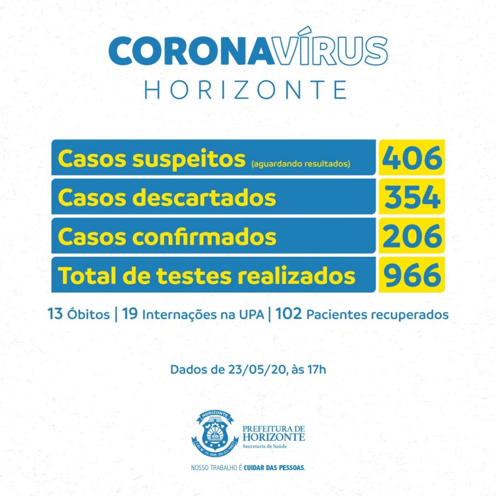 Outros três novos casos de Covid-19 também foram registrados. Horizonte trabalha agora com 206 casos confirmados, dentre eles 13 óbitos e 102 pacientes recuperados.