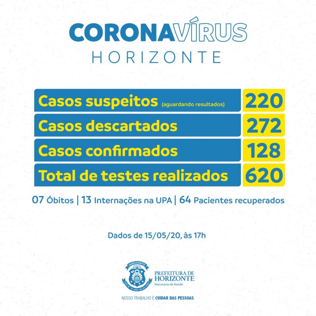 Seis novos casos confirmados de Covid-19 foram registrados em Horizonte nesta sexta-feira (15), após receber resultados de exames do Laboratório Central do Ceará (Lacen). O número total de pessoas com Covid-19 no Município agora é de 128, entre eles, 7 óbitos e 64 pacientes recuperados.