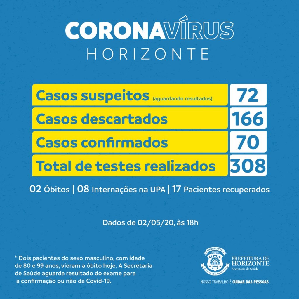 A Prefeitura de Horizonte, através da Secretaria de Saúde, informa o Boletim Epidemiológico para Covid-19 deste sábado (02/05), fechado às 18h, onde se apresenta 70 casos confirmados do novo coronavírus e 72 casos suspeitos aguardando resultado de exames.