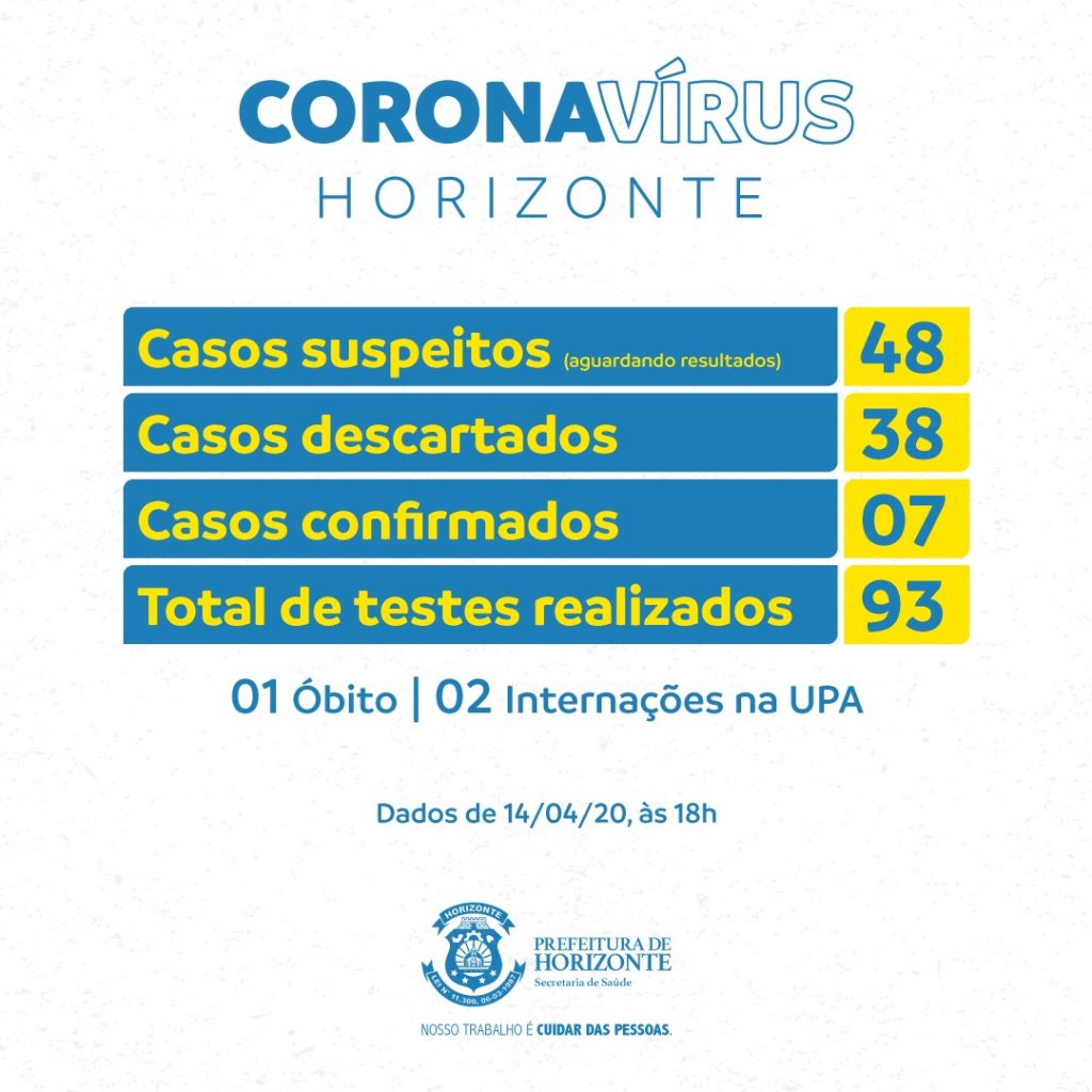 Horizonte continua com 7 casos confirmados do novo coronavírus (Covid-19), conforme o Boletim Epidemiológico da Secretaria Municipal de Saúde desta terça-feira (14/04), que também informa 48 pacientes suspeitos aguardando resultado de exame, 1 óbito confirmado pelo vírus e 38 casos descartados após análise pelo Laboratório Central de Saúde Pública do Ceará (Lacen).