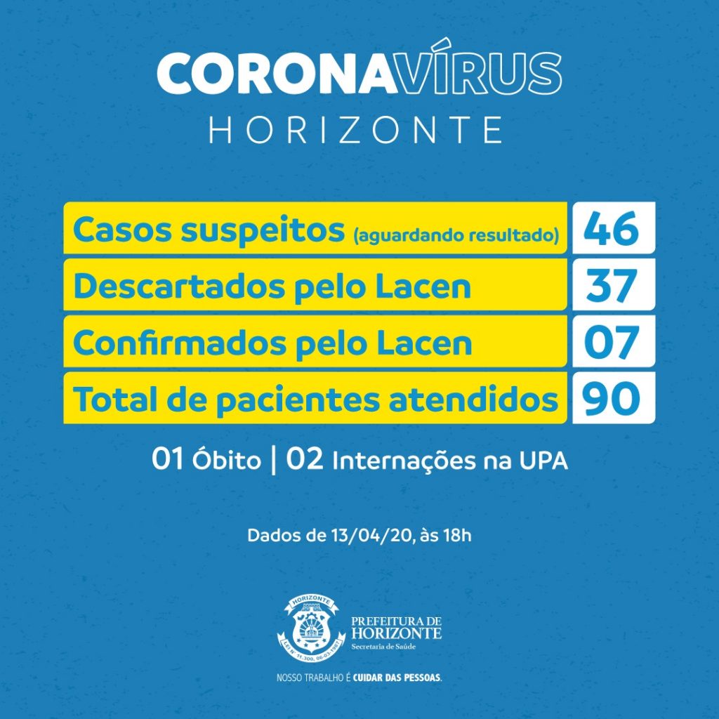 A Secretaria de Saúde informa que, desde o dia 18 de março, quando Horizonte passou a testar os pacientes suspeitos de terem contraído a Covid-19, já passaram pela rede pública do município 90 pessoas. Deste total, ainda estamos aguardando o resultado dos exames de 46 casos suspeitos.