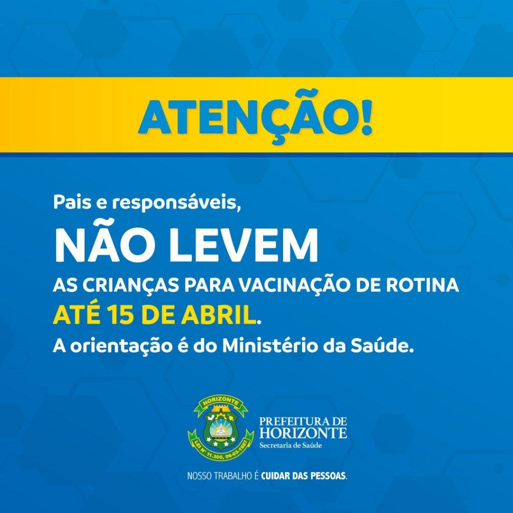 Atenção! A Secretaria de Saúde de Horizonte, por determinação do Ministério da Saúde, pede aos pais e responsáveis que NÃO LEVEM CRIANÇAS PARA VACINAÇÃO DE ROTINA.