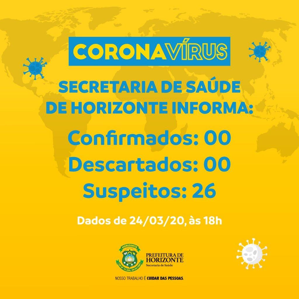 A Prefeitura de Horizonte, através da Secretaria de Saúde, informa que, até esta terça-feira, 24, às 18h, o município monitora 26 casos suspeitos do novo coronavírus (Covid-19), que aguardam resultado dos exames. Não há nenhuma confirmação e nenhum caso foi descartado.