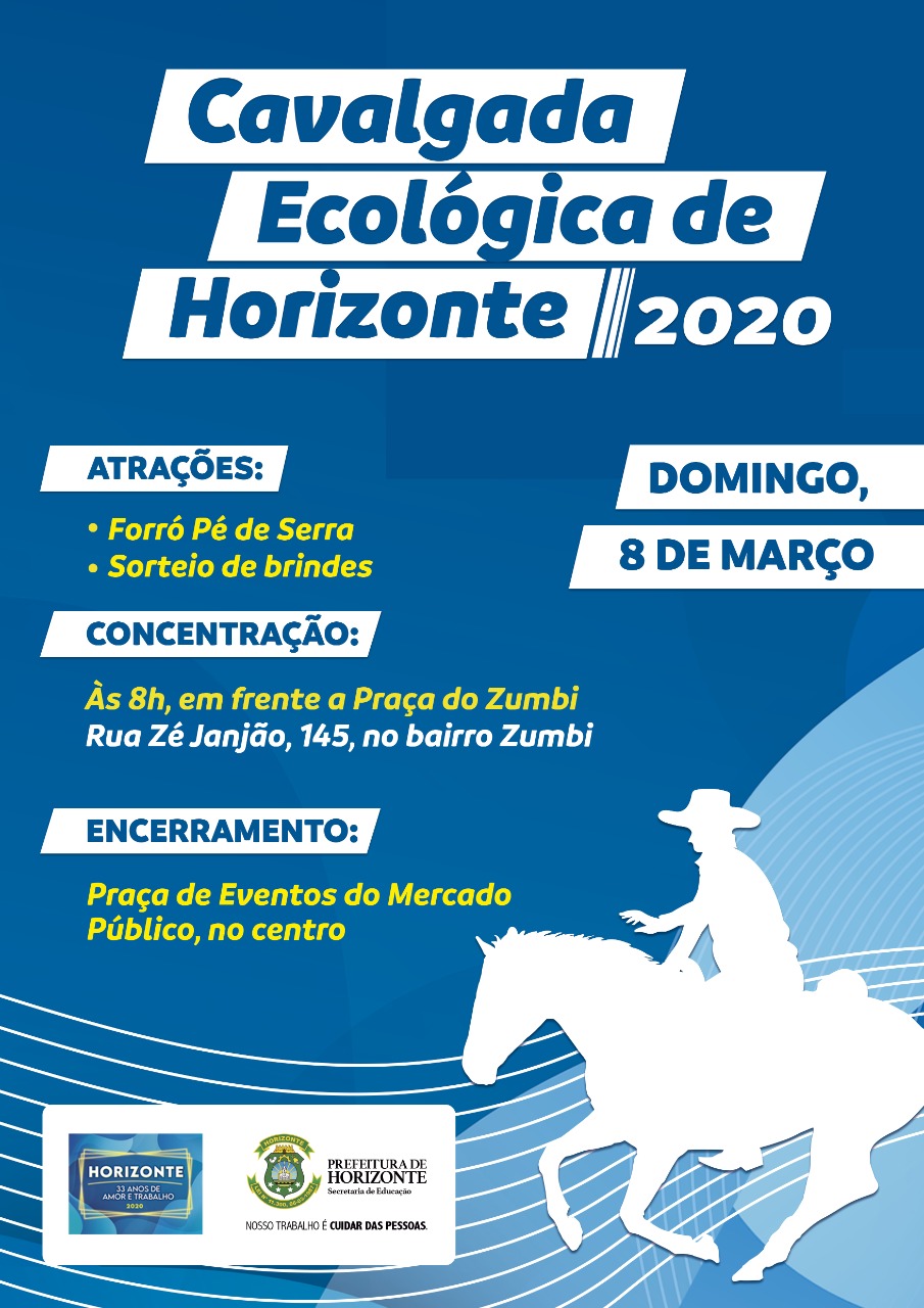 A tradicional Cavalgada Ecológica de Horizonte se prepara para sair em mais uma edição neste domingo, 8 de março, durante programação alusiva ao aniversário de 33 anos de emancipação política do município. A concentração acontece a partir das 8h, na Praça do Zumbi, na rua Zé Janjão, 145. Organizado pela Superintendência de Meio Ambiente, Agricultura e Recursos Hídricos, o evento ainda contará com atração de banda forró pé de serra, além de sorteio de brindes, e tem expectativa de reunir 350 participantes .