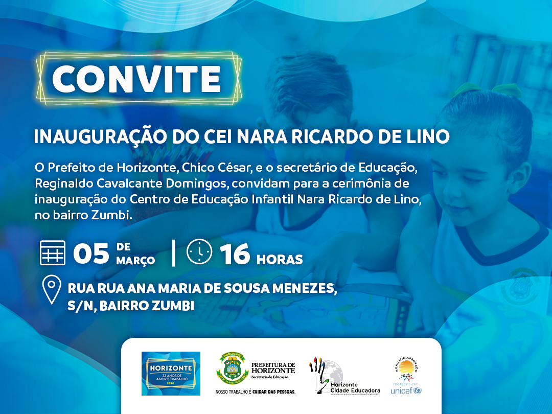 A Prefeitura de Horizonte, através da Secretaria de Educação, realiza nesta quinta-feira, 5 de março, a inauguração do Centro de Educação Infantil (CEI) Nara Ricardo de Lino, a partir das 16h, no bairro Zumbi.