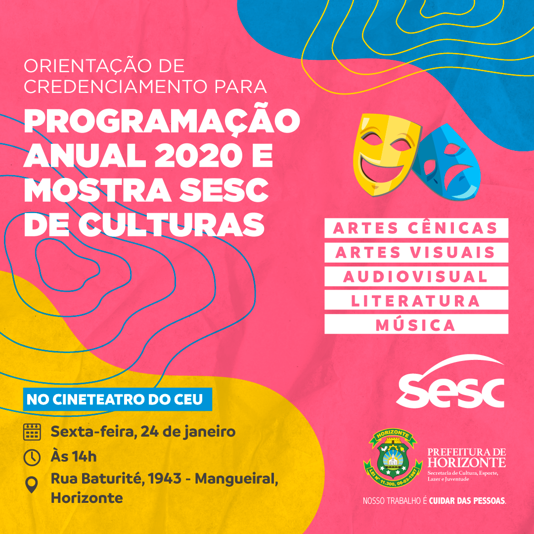 Atenção artistas de Horizonte! Na próxima sexta-feira, 24 de janeiro, uma equipe do Sesc Ceará estará em nossa cidade para dar orientações sobre o credenciamento para a Programação anual 2020 e Mostra Sesc de Culturas, que está com edital aberto (clique para ler) para projetos de Artes Cênicas (Teatro, Circo e Dança), Artes Visuais, Audiovisual, Literatura e Música. Será um momento para orientação e tirar dúvidas.