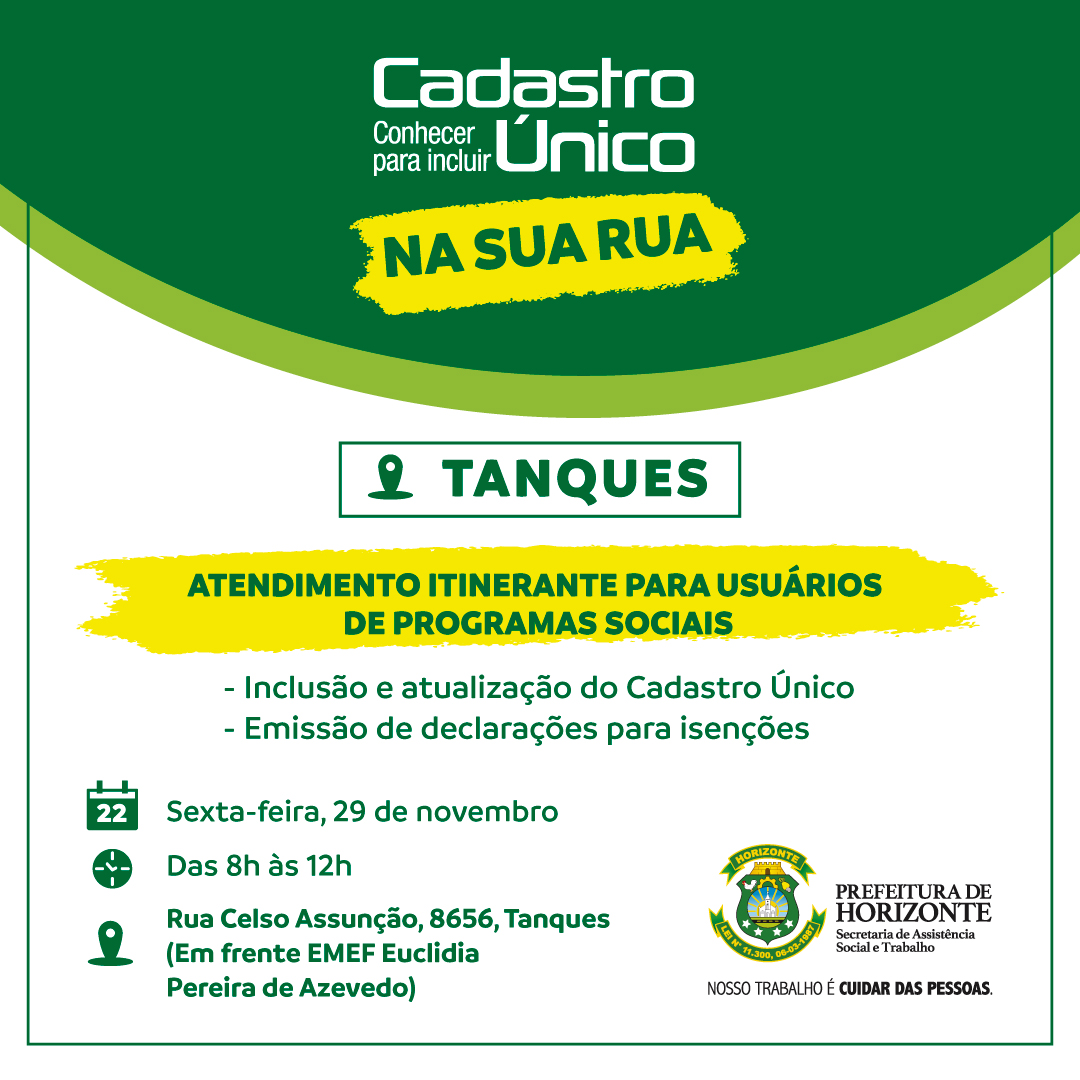 O projeto itinerante "Cadastro Único Na Sua Rua" estará nesta sexta-feira, 29, no Tanques. Executado pela Secretaria de Assistência Social e Trabalho de Horizonte, o projeto visa incluir, atualizar e atender com mais comodidade a população beneficiária de programas sociais moradoras de bairros e comunidades distantes dos Centros de Referência da Assistência Social (CRAS).