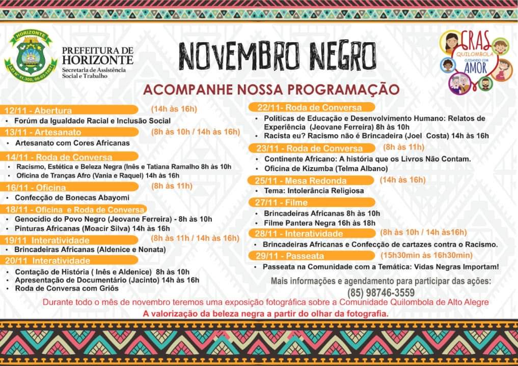 Ao longo do mês de novembro, e em especial nesta terça-feira, 20, é celebrada a Consciência Negra e o Combate à Discriminação Racial como política pública de inclusão e justiça social. Neste cenário, o Núcleo de Política de Promoção da Igualdade Racial de Horizonte (NUPPIRH), da Secretaria de Assistência Social e Trabalho, preparou programação completa com cursos, rodas de conversa, oficinas, exibição de filmes e fóruns de discussão, que começou no dia 12 e segue até dia 29 no CRAS Quilombola, na comunidade Alto Alegre.