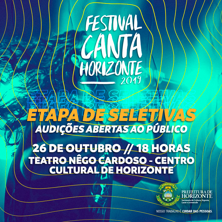 O Festival Canta Horizonte 2019 realiza neste sábado, 26, a partir das 18h, uma série de audições seletivas no Teatro do Centro Cultural Tasso Jereissati. As audições são abertas ao público que deseje assistir e prestigiar os jovens talentos.