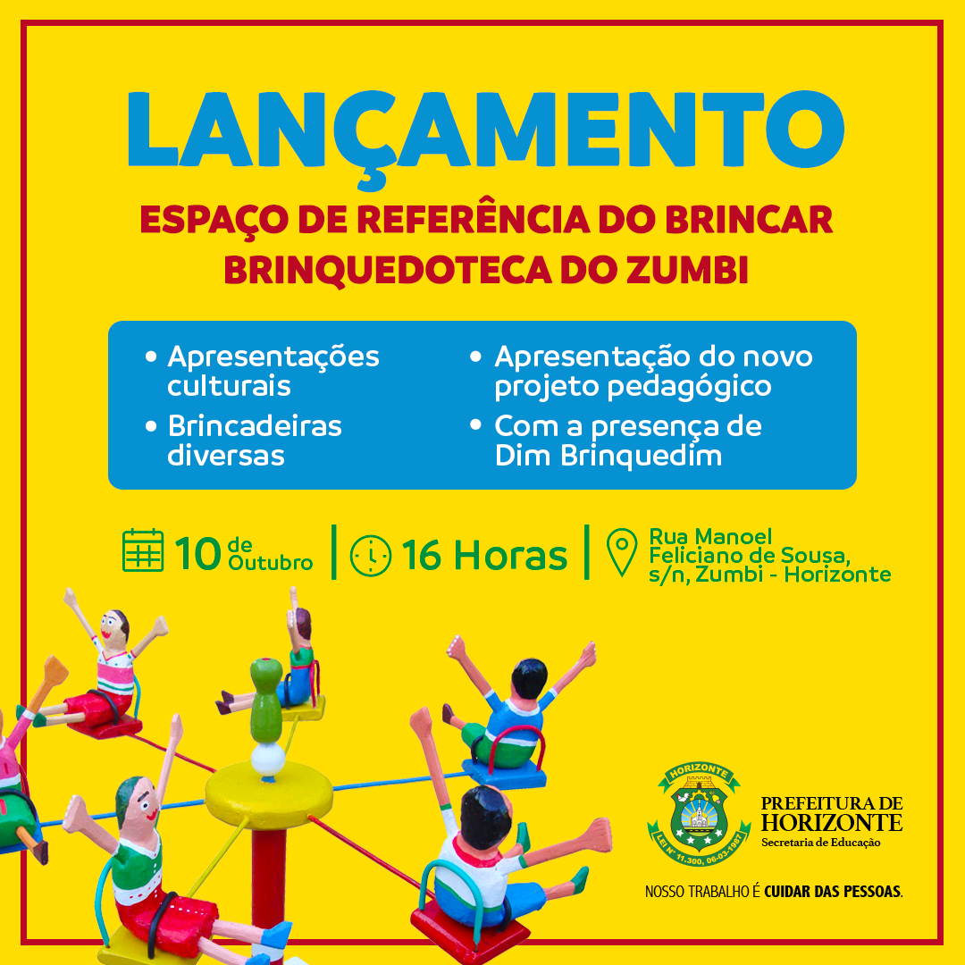 O Município de Horizonte ganha mais um equipamento voltado para a aprendizagem e lazer das crianças nesta quinta-feira, 10, com o lançamento do Espaço de Referência do Brincar, na reabertura da brinquedoteca do bairro Zumbi, às 16h.