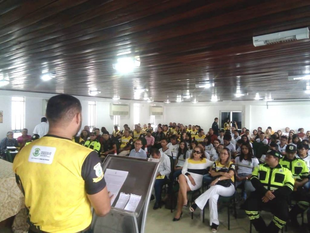 Finalizando a programação, os agentes do Demutran participam de palestra educativa com crianças na Escola Joaquim Antônio da Silva.