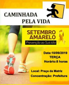 Seguindo a programação do Setembro Amarelo no Município de Horizonte, a Secretaria de Saúde realizará nesta terça-feira, 10, a Caminhada Pela Vida com usuários dos serviços de atenção psicossocial, profissionais da saúde mental e comunidade em geral.