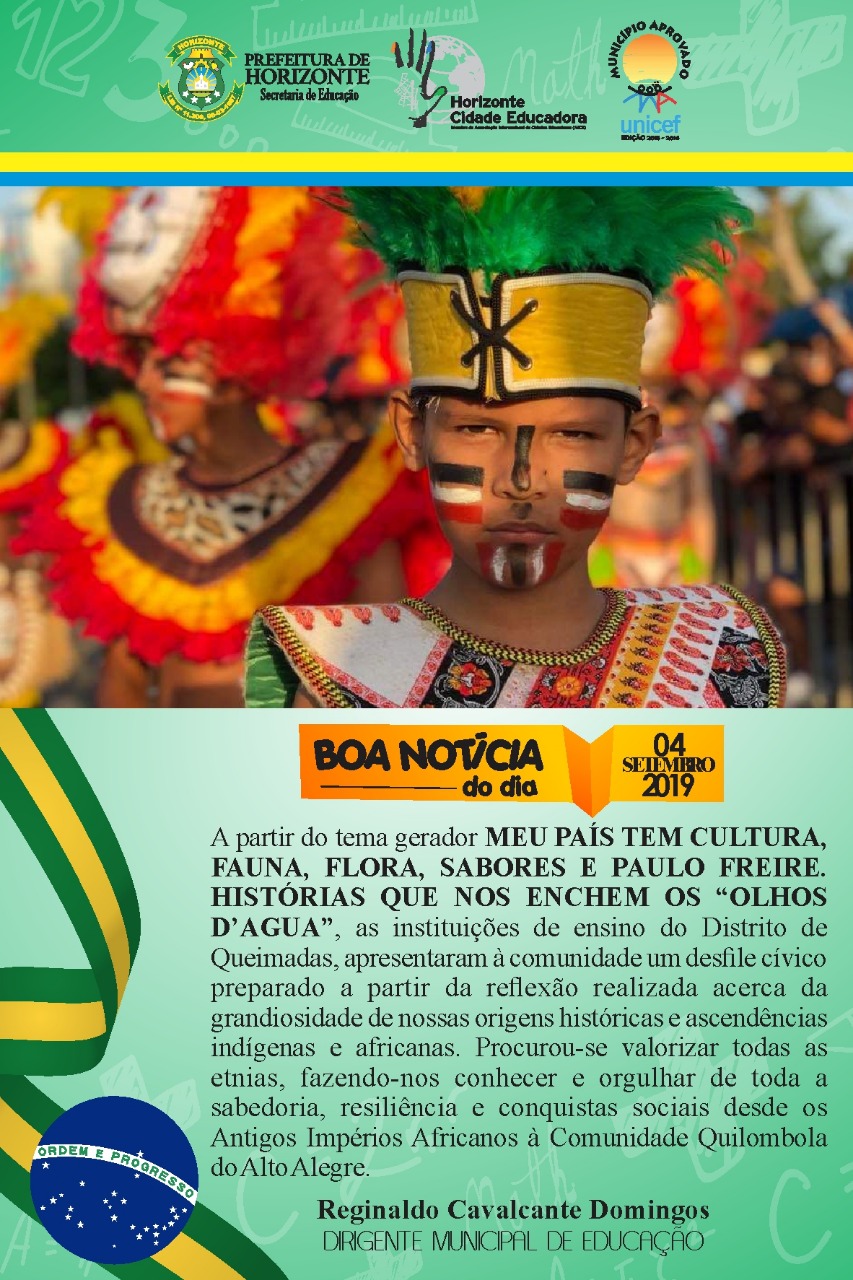 A partir do tema gerador "Meu País tem cultura, fauna, flora, sabores e Paulo Freire. Histórias que nos enchem os olhos dágua", as instituições de ensino do Distritos de Queimadas apresentaram à comunidade um desfile cívico preparado a partir da reflexão realizada acerca da grandiosidade de nossas origens históricas e ascendências indígenas e africanas.