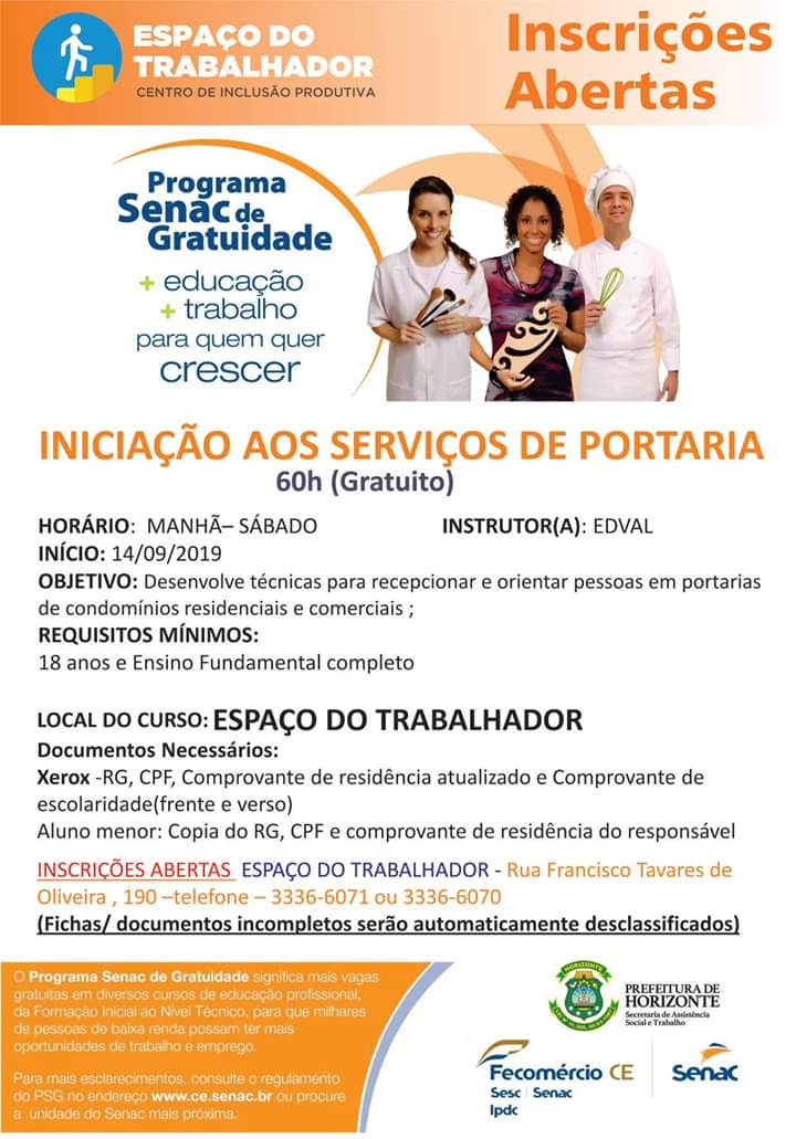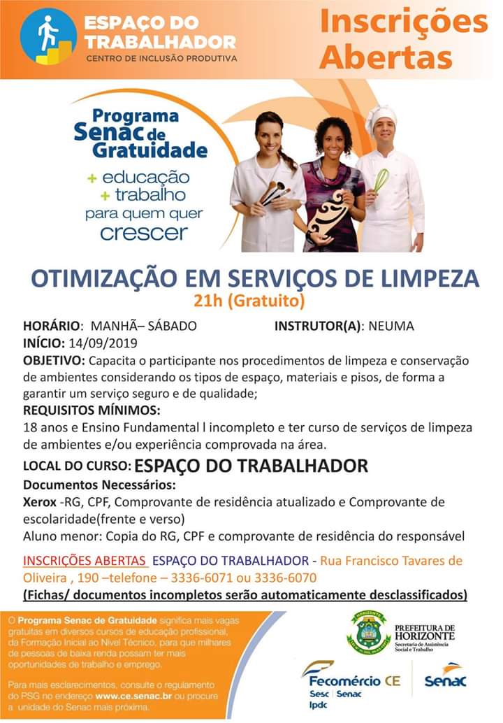 O Espaço do Trabalhador, equipamento da Secretaria de Assistência Social e Trabalho da Prefeitura Municipal de Horizonte, está com inscrições abertas para cursos gratuitos de capacitação em Iniciação em Otimização em Serviços de Limpeza (21h) e Serviços de Portaria (60h).