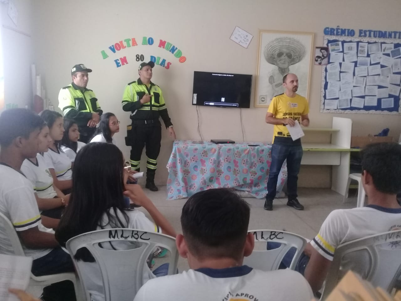 Agentes de trânsito do Departamento Municipal de Trânsito e Transporte de Horizonte (DEMUTRAN) visitam a EMEF Maria Luiza Barbosa para realizar uma roda de conversa com os alunos do 9° ano sobre o tema segurança no trânsito. O Objetivo da iniciativa foi apresentar o papel de cada um no trânsito e refletir sobre as condutas inseguras e suas consequências no dia a dia no deslocamento das pessoas. Esta atividade foi uma das ações alusivas ao Maio Amarelo.