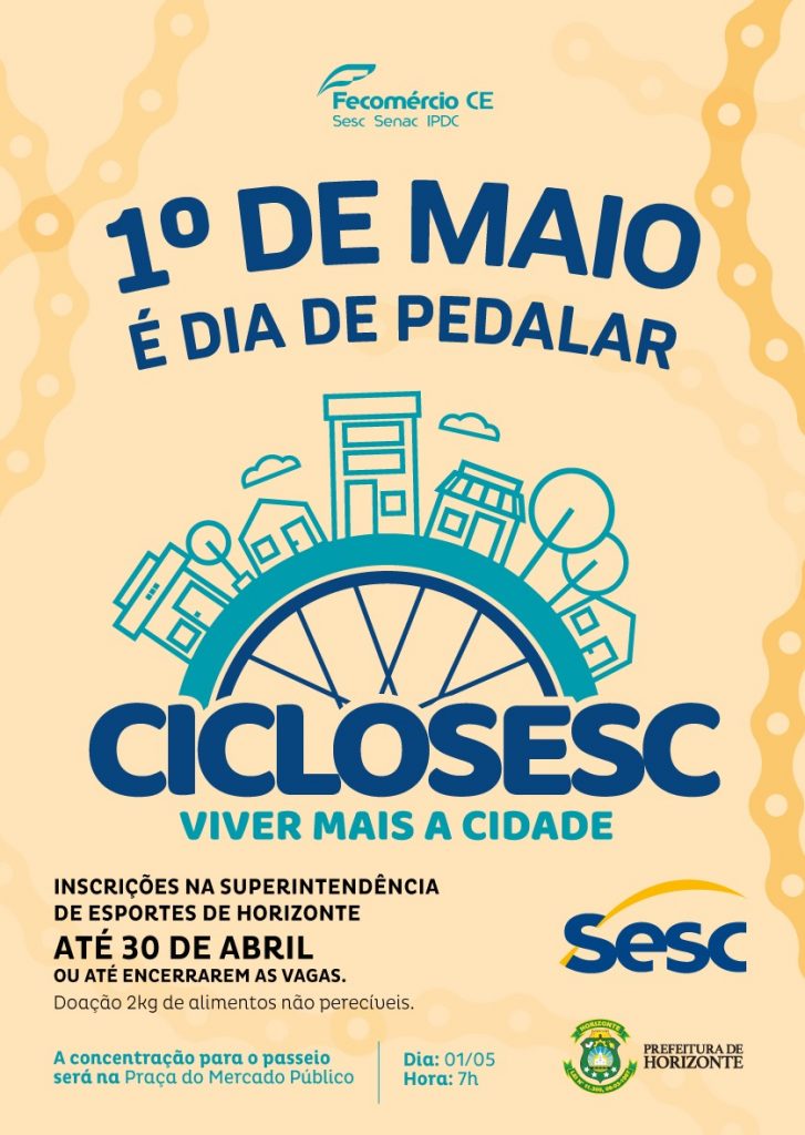 As inscrições já estão abertas para o CicloSesc em Horizonte na Superintendência de Esportes do município até o dia 30 de abril. Para participar, é necessário a doação de 2kg de alimentos não perecíveis. O Ciclo Sesc é um passeio ciclístico com foco na qualidade de vida, no lazer e no turismo. O evento mostra que, além de uma prática saudável, o ciclismo pode ser também um meio para que as pessoas possam conhecer a sua cidade, sua arquitetura, pontos turísticos, patrimônios históricos e culturais. Trata-se também de uma oportunidade de encontro, socialização e integração entre os participantes e suas famílias. A concentração do passeio ciclístico será no dia 1º de maio, às 7h, na Praça do Mercado Público. Mais informações: (85) 3336-6095.