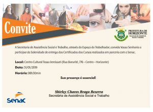 A Prefeitura de Horizonte, por meio da Secretaria de Assistência Social e Trabalho, realiza nesta quinta-feira (31), às 8h30, a solenidade de entrega dos certificados dos cursos ocorridos no Espaço do Trabalhador. O equipamento foi implantado em agosto de 2018 e já capacitou cerca de 300 pessoas em apenas cinco meses de funcionamento. Entre os cursos ofertados estão designer de sobrancelhas, corte e costura, cabeleireiro, modelista, salgadeiro, pizzaiolo, manicure e pedicure. O Espaço do Trabalhador fica localizado na Rua Baturité 776 Centro Horizonte. Mais informações: (85) 3336.6071.