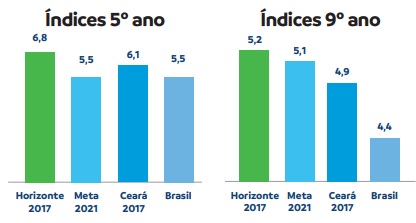 O IDEB é o Índice de Desenvolvimento da Educação Básica formulado para medir a qualidade do aprendizado no Brasil e permite que a população saiba como está o ensino na Escola, no Município, no Estado e na Nação. Horizonte alcançou o Índice de 6,8 no 5º ano e 5,2 no 9º ano na avaliação do IDEB 2017.