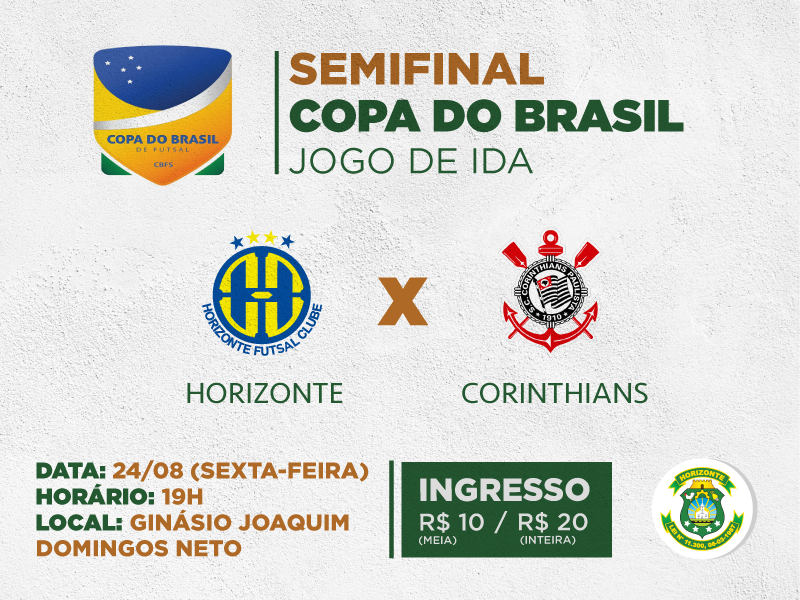 O Horizonte tem um grande desafio pela Copa do Brasil de Futsal: a semifinal diante do Corinthians. Será na próxima sexta-feira, dia 24 de agosto, às 19h, no ginásio Joaquim Domingos Neto. Sua torcida é muito importante para ajudar o nosso time a conquistar mais esse campeonato.