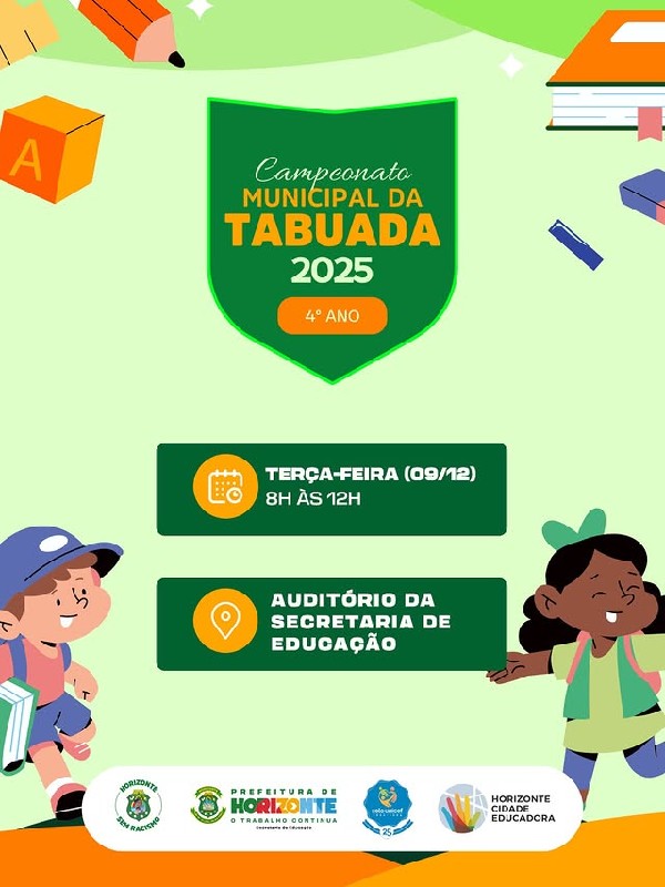 A Prefeitura de Horizonte por meio da Secretaria de Educação, irá realizar nesta terça-feira (09/12), no Auditório da Secretaria de Educação, a última fase do Campeonato Municipal da Tabuada, que envolve os alunos dos 4º anos da Rede Municipal de Ensino. ????