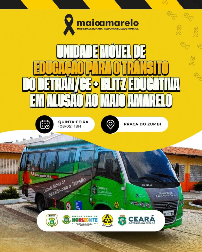 Em referência ao movimento Maio Amarelo, que tem como objetivo promover a conscientização para um trânsito mais seguro, a Unidade Móvel de Educação de Trânsito do DETRAN-CE estará em Horizonte nesta quinta-feira (08/05), a partir das 18h, na Praça do Zumbi.