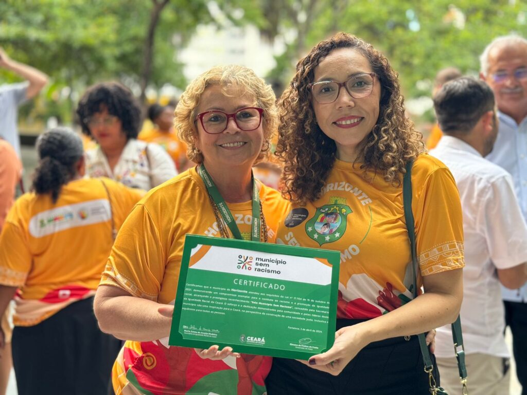 Em reconhecimento à atenção da Prefeitura com os descendentes quilombolas, Horizonte recebeu neste ano o Selo Município Sem Racismo, certificação pertencente à campanha Ceará sem Racismo, do Governo do Estado, por meio da Secretaria da Igualdade Racial (Seir). A condecoração se deu como consequência do compromisso da cidade com a equidade racial e das ações implementadas para fortalecer e valorizar a população negra, as comunidades quilombolas, os povos de terreiro e os ciganos. "A obtenção do selo celebra nosso compromisso com a política de igualdade racial de forma intersetorial e qualifica ainda mais a educação para as relações étnico-raciais em Horizonte, colocando-nos como referência dessa pauta no estado", ressalta Cássia.