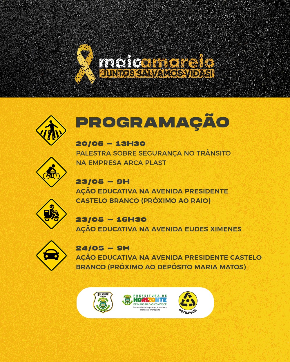 A Secretaria de Segurança, Cidadania, Trânsito e Transporte através do Departamento Municipal de Trânsito de Horizonte está promovendo uma a programação especial sobre o #MaioAmarelo, campanha de conscientização sobre segurança no trânsito, que conta com palestras e ações educativas.