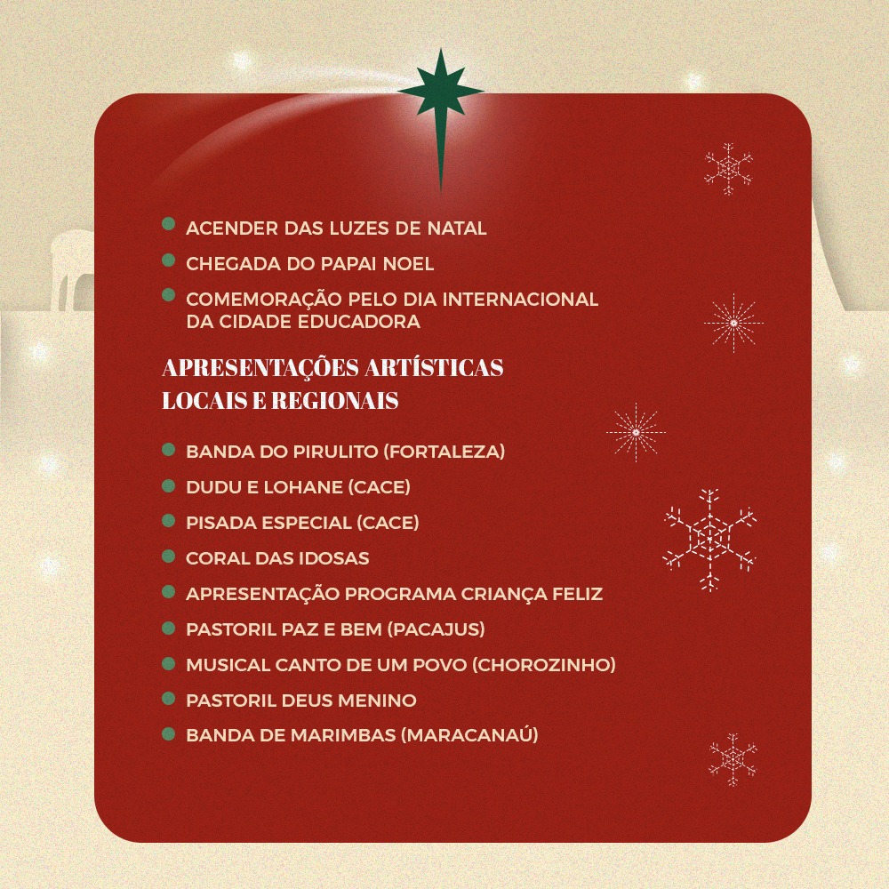 O evento irá acontecer amanhã (30/11), a partir das 16h, no Paço Municipal da Prefeitura. Confira a programação completa das apresentações culturais locais e regionais. Na ocasião, também haverá o acender das luzes de Natal, a chegada do Papai Noel e uma comemoração pelo Dia Internacional da Cidade Educadora. Participe!