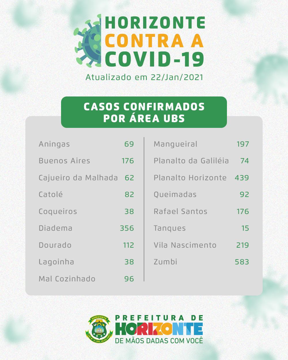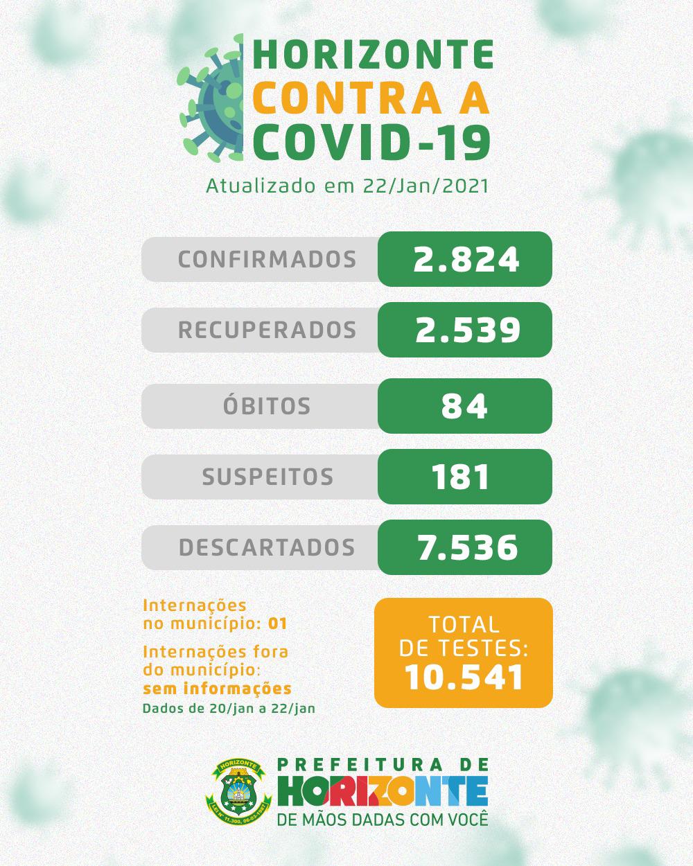A Prefeitura de Horizonte divulga diariamente, por meio da Secretaria Municipal da Saúde (SMS), seu boletim referente ao cenário epidemiológico da Covid-19 no município.