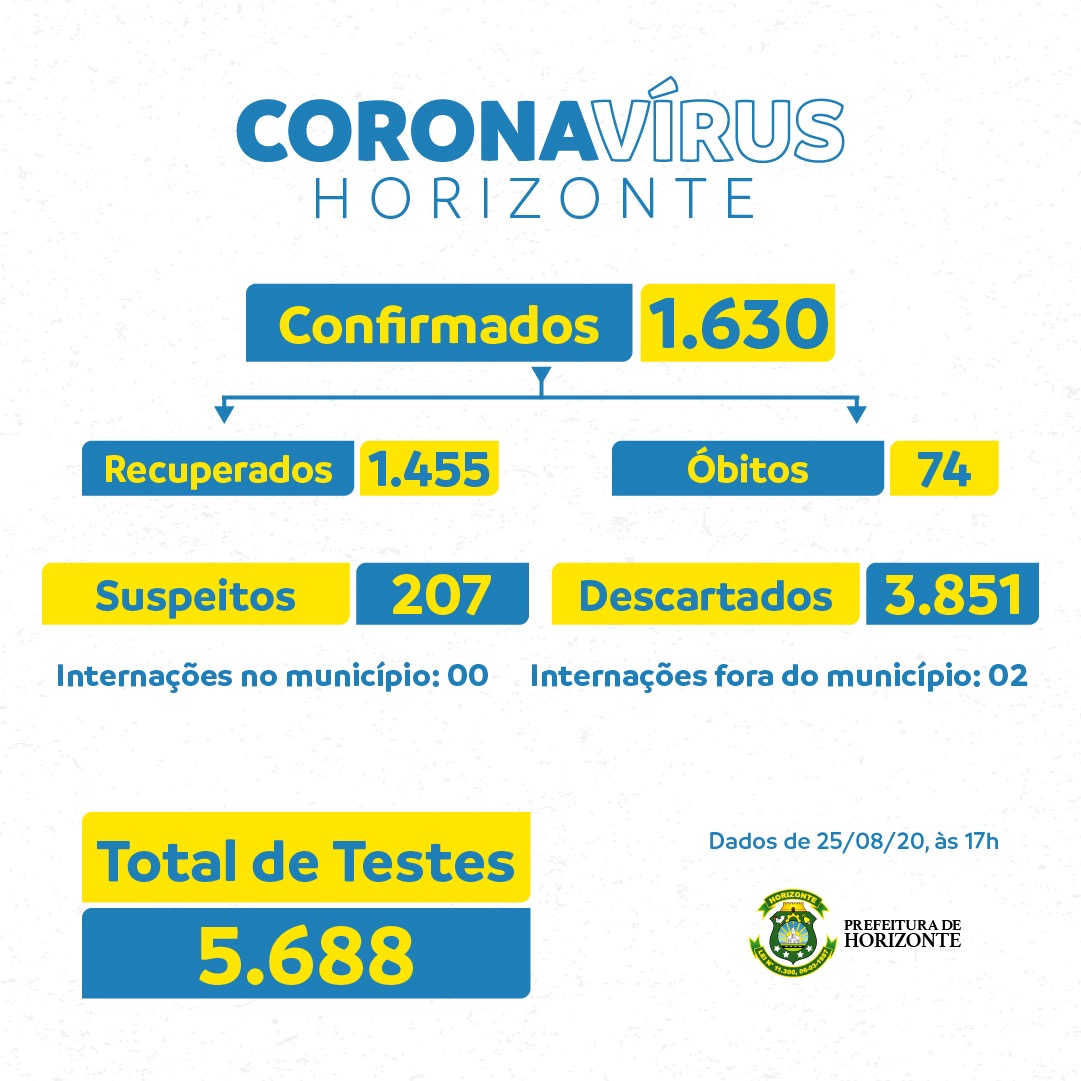 São 1.630 casos confirmados de Covid-19 em Horizonte, entre os quais 1.455 são pacientes recuperados, 101 são pacientes em tratamento e 74 são óbitos decorrentes da doença.