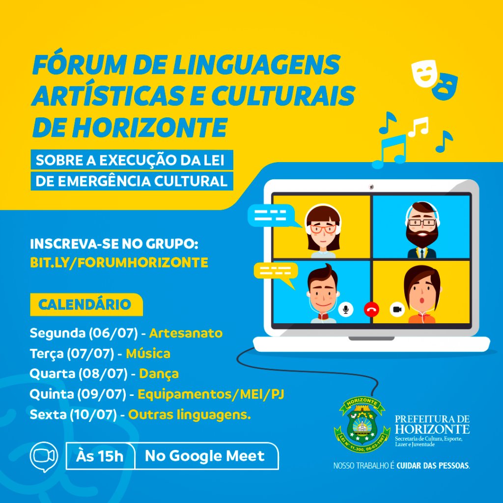 A Prefeitura de Horizonte, através da Secretaria de Cultura, realiza entre os dias 06 e 10 de julho o Fórum de Linguagens Artísticas e Culturais sobre a execução da Lei Nacional de Emergência Cultural (Lei Aldir Blanc), que prevê destinação de recursos para fomento de ações emergenciais de apoio ao setor cultural e de economia criativa.