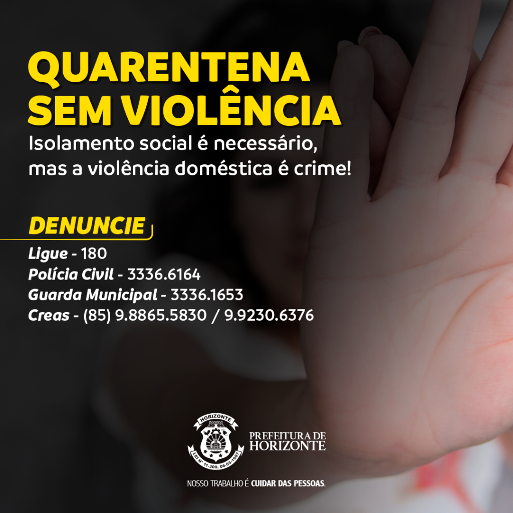 O combate à violência doméstica não pode parar com a pandemia do coronavírus. A Prefeitura de Horizonte reforça que os canais de denúncias e de atendimento às vítimas de violência continuam funcionando normalmente. Você não está sozinha. Não se cale, denuncie.
