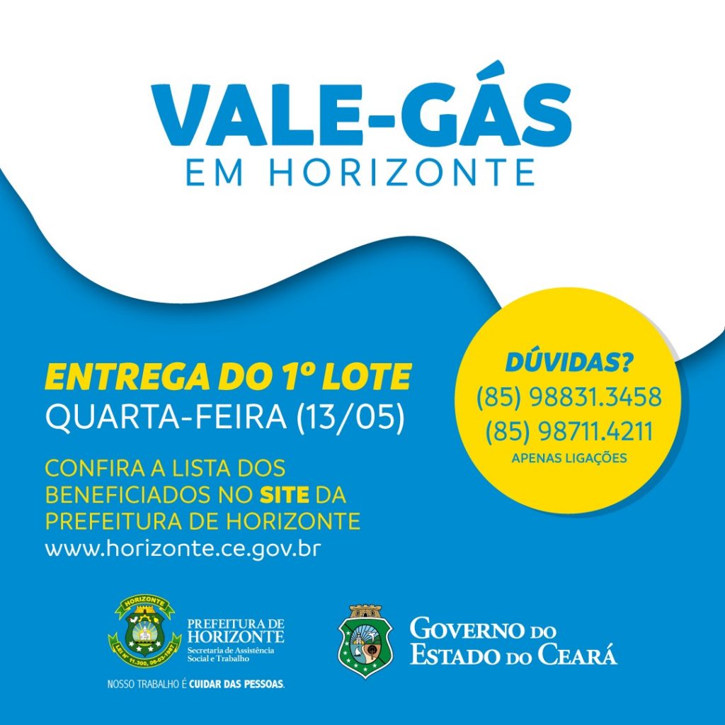 A Prefeitura de Horizonte, através da Secretaria de Assistência Social e Trabalho, inicia nesta quarta-feira (13) a distribuição do primeiro lote de tíquetes do vale-gás social para as 155 famílias selecionadas pela Secretaria da Proteção Social, Justiça, Cidadania, Mulheres e Direitos Humanos do Estado do Ceará (SPS). O benefício é uma iniciativa do Governo do Estado do Ceará e conta com o apoio da Prefeitura para localizar e entregar o Vale-Gás a quem mais precisa. Confira a lista no link no fim do texto.