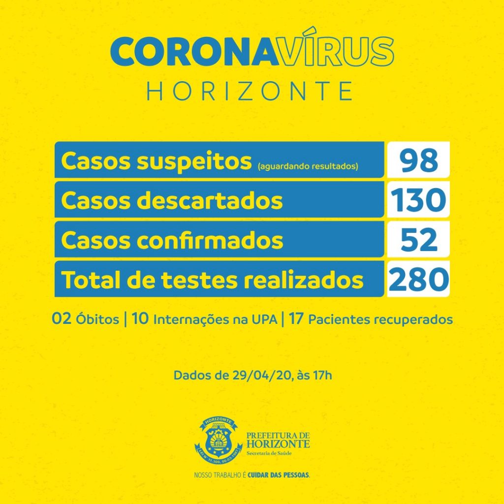 Saltou de 38 para 52 o número de casos confirmados do novo coronavírus (Covid-19) em Horizonte, segundo informa Boletim Epidemiológico da Secretaria de Saúde, fechado às 17h, desta quarta-feira (29). O Município possui 2 óbitos pela doença e 17 pacientes estão recuperados.