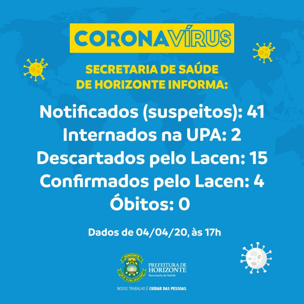 Neste sábado (04/04), a Secretaria de Saúde de Horizonte divulgou o Boletim Epidemiológico Covid-19, às 16h. Diariamente, antes de fazer essa divulgação, a Secretaria consulta o Sistema de Monitoramento da Secretaria de Saúde do Estado para obter os resultados dos exames enviados ao Lacen. Neste horário, o Sistema não registrava nenhum caso positivo em nosso Município. Alguns minutos depois de publicar a informação nas redes sociais da Prefeitura de Horizonte, soubemos através de uma matéria no G1, que a Secretaria de Saúde tinha divulgado a informação de que Horizonte tinha quatro casos confirmados.