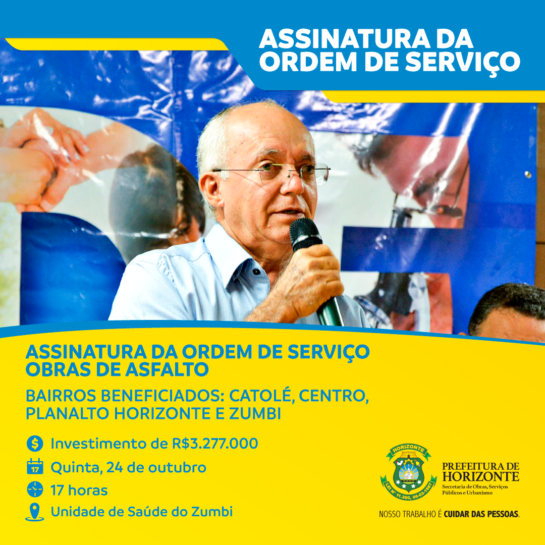 A Prefeitura Municipal de Horizonte se prepara para investir mais de R$ 3 milhões em obras de asfaltamento em diversos bairros da cidade. A cerimônia pública de assinatura de Ordem de Serviço acontece nesta quinta-feira, 24, às 17h, em frente a Unidade Básica de Saúde do Zumbi com presença do Prefeito Chico César, membros do secretariado e autoridades da Câmara Municipal.