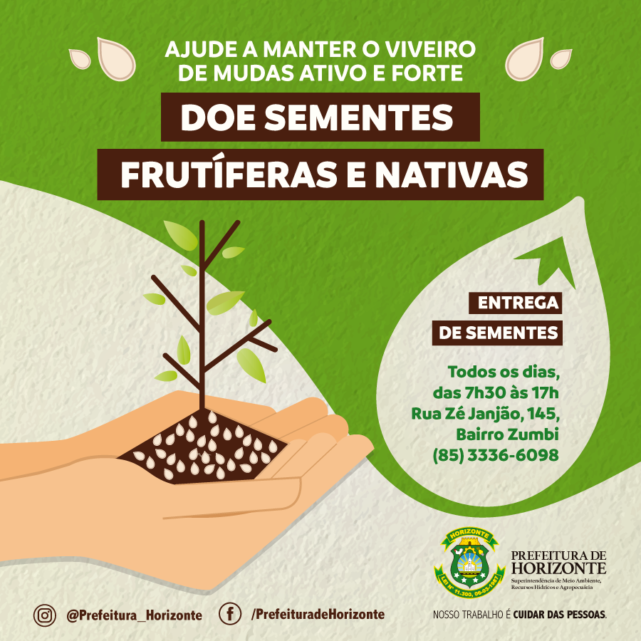 A Prefeitura Municipal de Horizonte, através da Superintendência de Meio Ambiente, Recursos Hídricos e Agropecuária, inicia nesta semana uma campanha permanente de doação de sementes para abastecimento do Viveiro de Mudas do Município, projeto ambiental que semanalmente distribui centenas de mudas de plantas frutíferas, medicinais e ornamentais a população, agricultores e escolas.