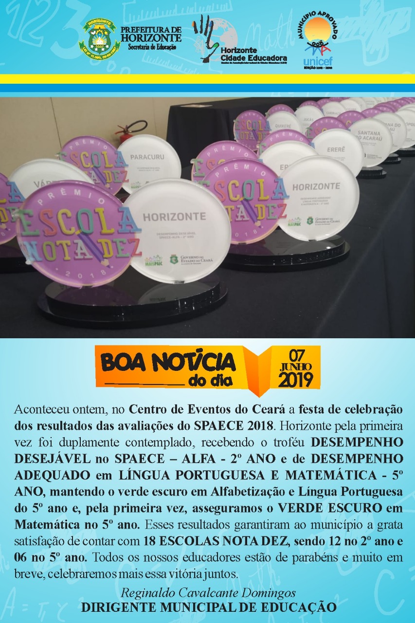 18 escolas de Horizonte conquistaram o título Escola NOTA DEZ segundo resultados do SPAECE 2018