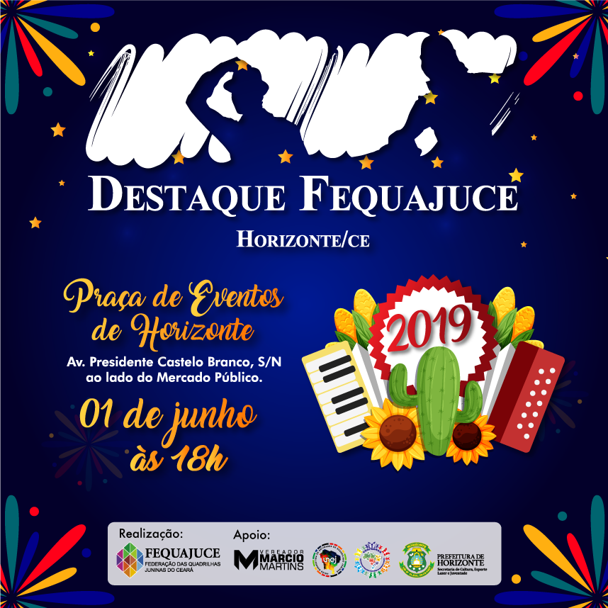 Horizonte será palco do Destaque Fequajuce 2019 nesta sábado (1º), às 18h, na Praça de Eventos do município (ao lado do Mercado Público). O evento é organizado pela Federação das Quadrilhas Juninas do Ceará (Fequajuce) e a expectativa de público é de 4 mil pessoas. A inscrição para participar das premiações do evento é até esta sexta-feira (31) na sede da Fequajuce (Rua Guilherme Rocha 218 9º andar, sala 901 Centro Fortaleza), das 8h às 17h ou pelo e-mail destaquefequajuce@gmail.com. As categorias desta edição serão: Casal de noivos adulto; Rainha; Rainha da diversidade; Princesa e Casal de Noivos Infantil. Mais informações (85) 98704-5222/ 98635-7890.