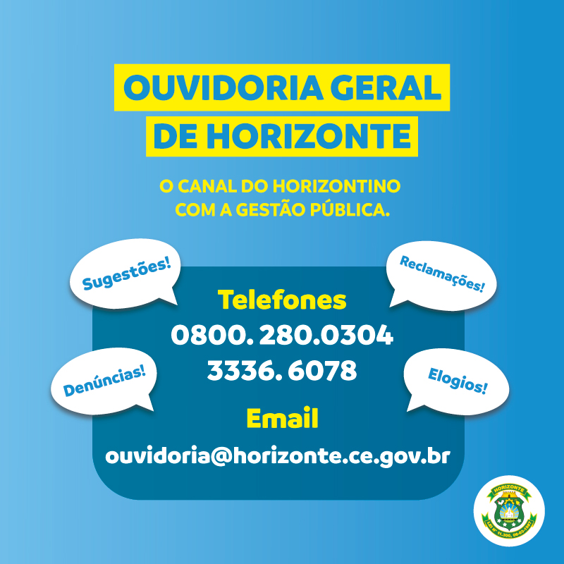 Nós acreditamos que podemos aprender todos juntos, uns ensinando aos outros. Por isso, a Ouvidoria da Prefeitura de Horizonte quer te ouvir. Estamos a postos para colher sugestões, saber opiniões, receber críticas, acolher denúncias e levar todas essas contribuições para o encaminhamento nos órgãos competentes da administração municipal. A Ouvidoria serve também para concretizar a participação de cada horizontino nos rumos de nosso município.