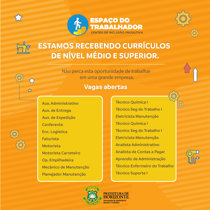 O Espaço do Trabalhador, equipamento da Prefeitura de Horizonte, está recebendo currículo de nível médio e superior para atuar em uma grande empresa a ser instalada no município. São inúmeras vagas para as seguintes funções: Auxiliar Administrativo, Auxiliar de Entrega, Auxiliar de Expedição, Conferente, Encarregado Logística, Faturista, Motorista, Motorista Carreteiro, Operador de Empilhadeira, Mecânico de Manutenção, Planejador Manutenção, Técnico Química I, Técnico Segurança do Trabalho I, Eletricista Manutenção, Técnico Química I, Técnico Segurança do Trabalho I, Eletricista Manutenção, Analista Administrativo, Analista de Contas a Pagar, Aprendiz de Administração, Técnico Enfermeiro do Trabalho e Técnico Suporte I. Os interessados devem comparecer ao Espaço do Trabalhador com os seus currículos. O equipamento fica localizado na Av. Francisco Tavares s/n Centro (ao lado do Mercado Público).