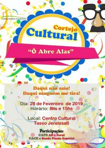 Nesta quinta-feira (28) será realizado o cortejo cultural de carnaval dos pacientes do Centro de Atendimento Clínico e Educacional Maria de Nazaré Domingos (CACE), dos CAPS AD e Geral com a participação da Banda Pisada Especial. O objetivo do encontro é promover a integração entre os pais, os pacientes e a comunidade em geral. Serão dois cortejos ao longo do dia, o primeiro às 8h, e o segundo, às 15h, em frente ao Centro Cultural Tasso Jereissati.