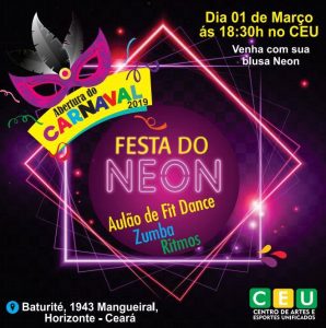 O Centro de Artes e Esportes Unificados (CEU) de Horizonte realiza nesta sexta-feira (1º) um aulão de fitdance, ritmos e zumba em ritmo de carnaval. O aulão será das 18h30 às 20h e a sugestão é que os participantes venham com roupas na cor neon. O evento é gratuito e aberto para a população horizontina. O CEU fica localizado na Rua Baturité nº 1943 Mangueiral Tel: 3336. 6084.